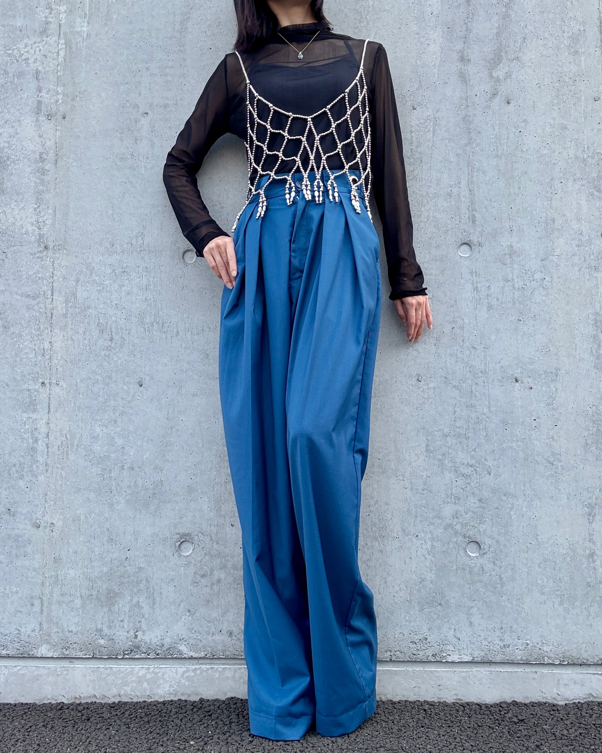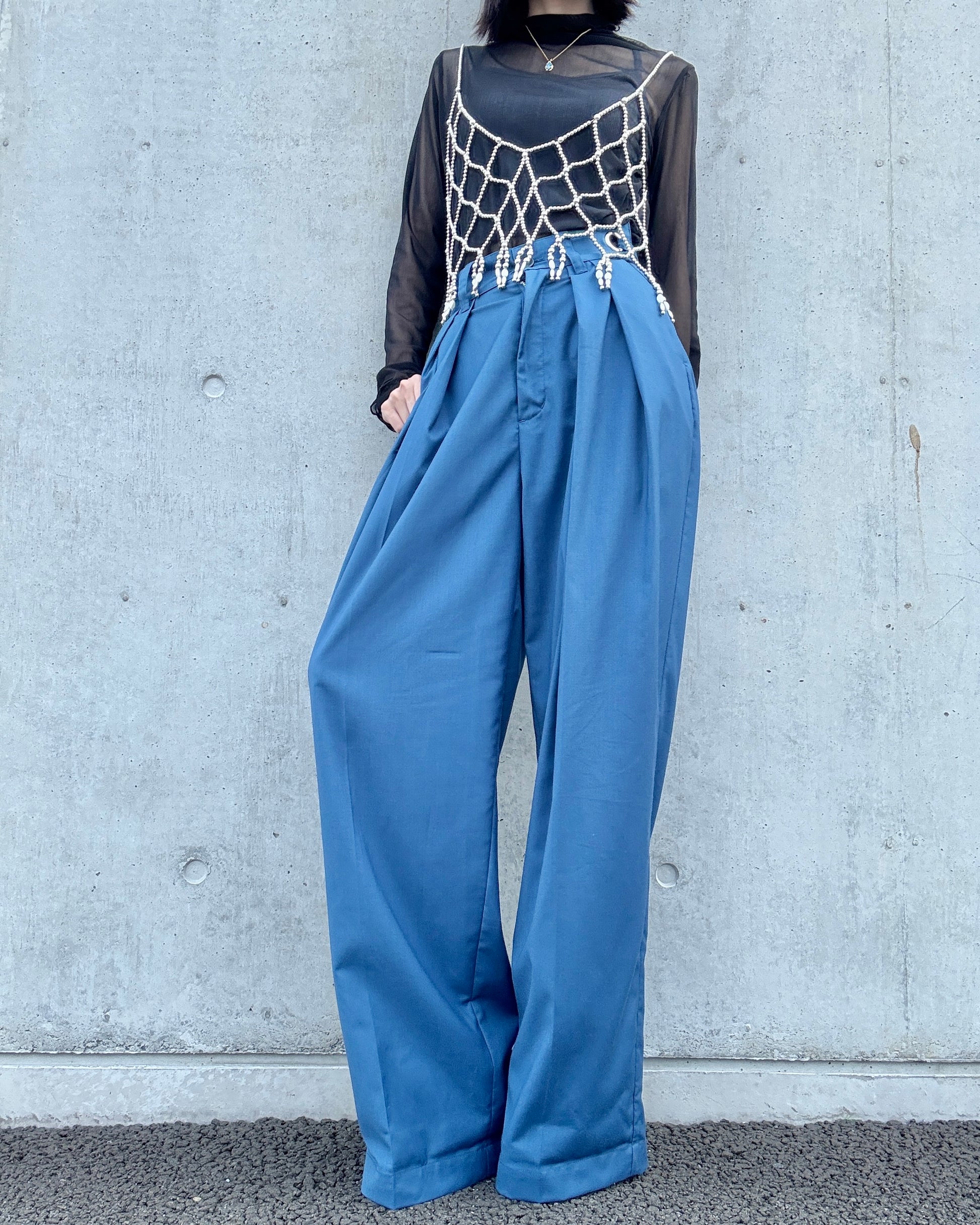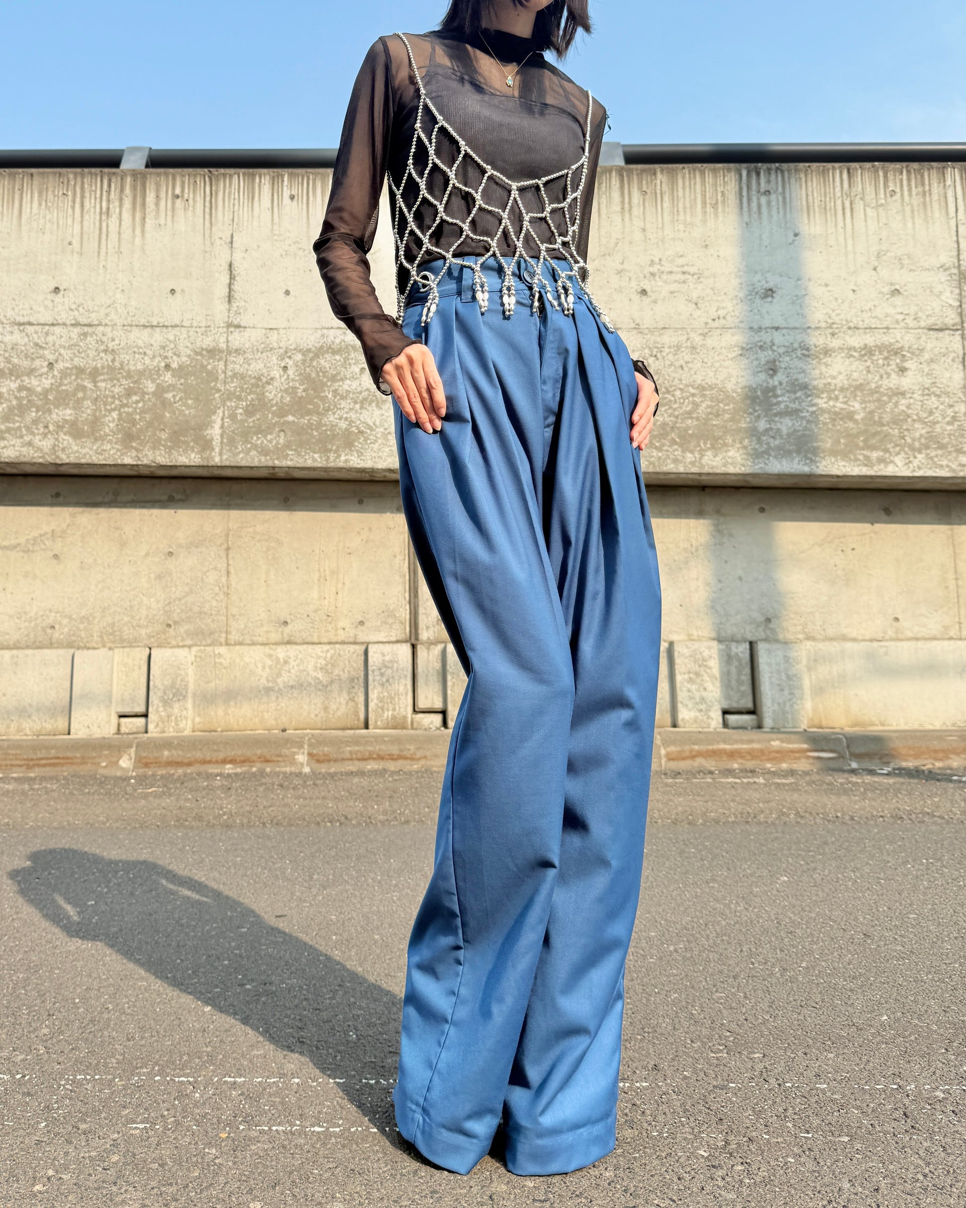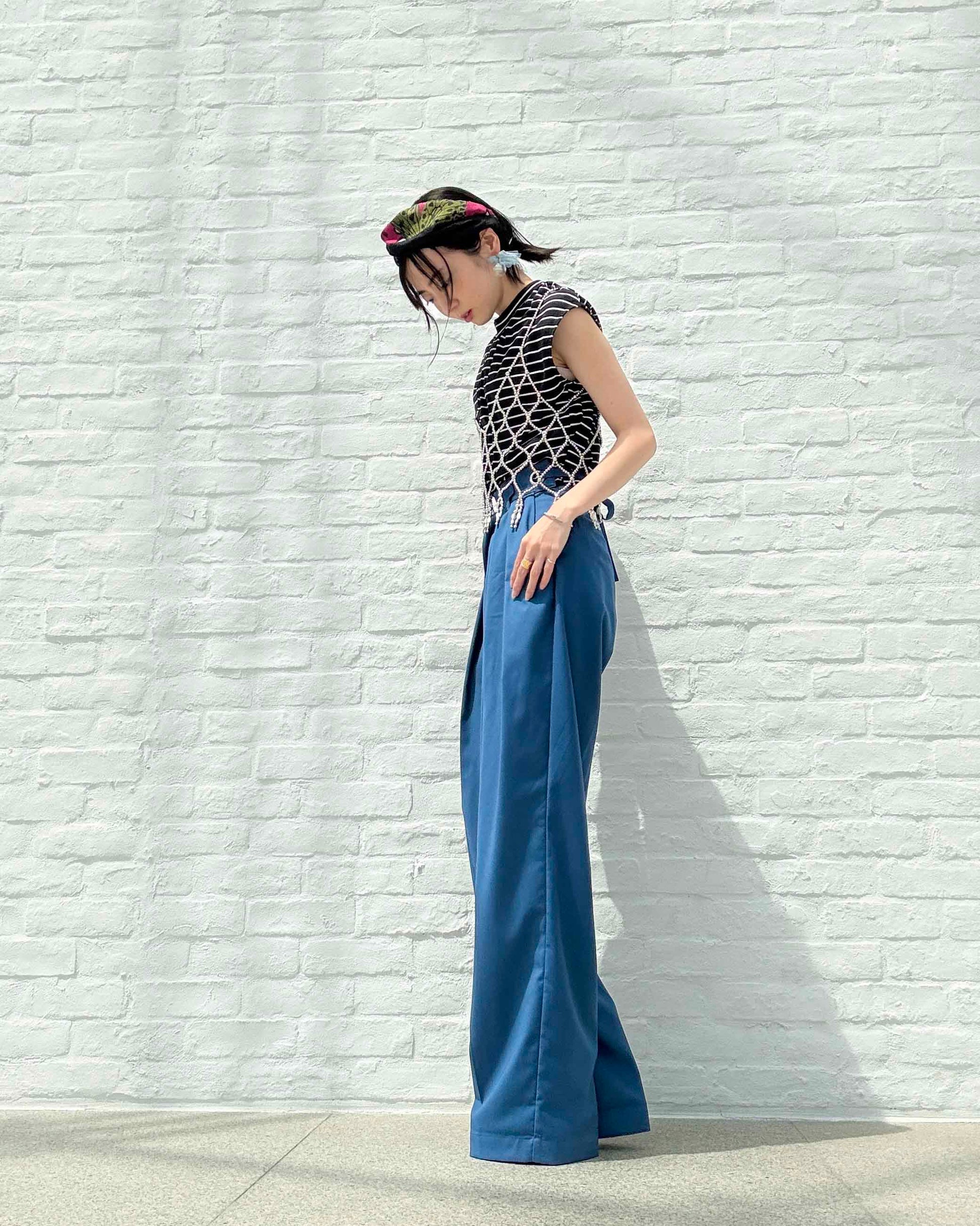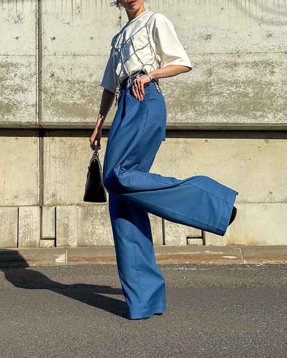 目を引く明るめのネイビーカラーは、シーズンを問わず取り入れやすく、カラーアイテムとのスタイリングにも◎