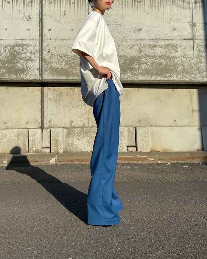 深めのインタックで立体感を出しつつ、落ち感のある素材が広がりすぎない上品なシルエットを演出します。