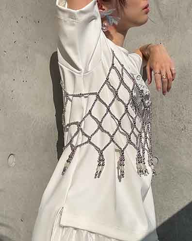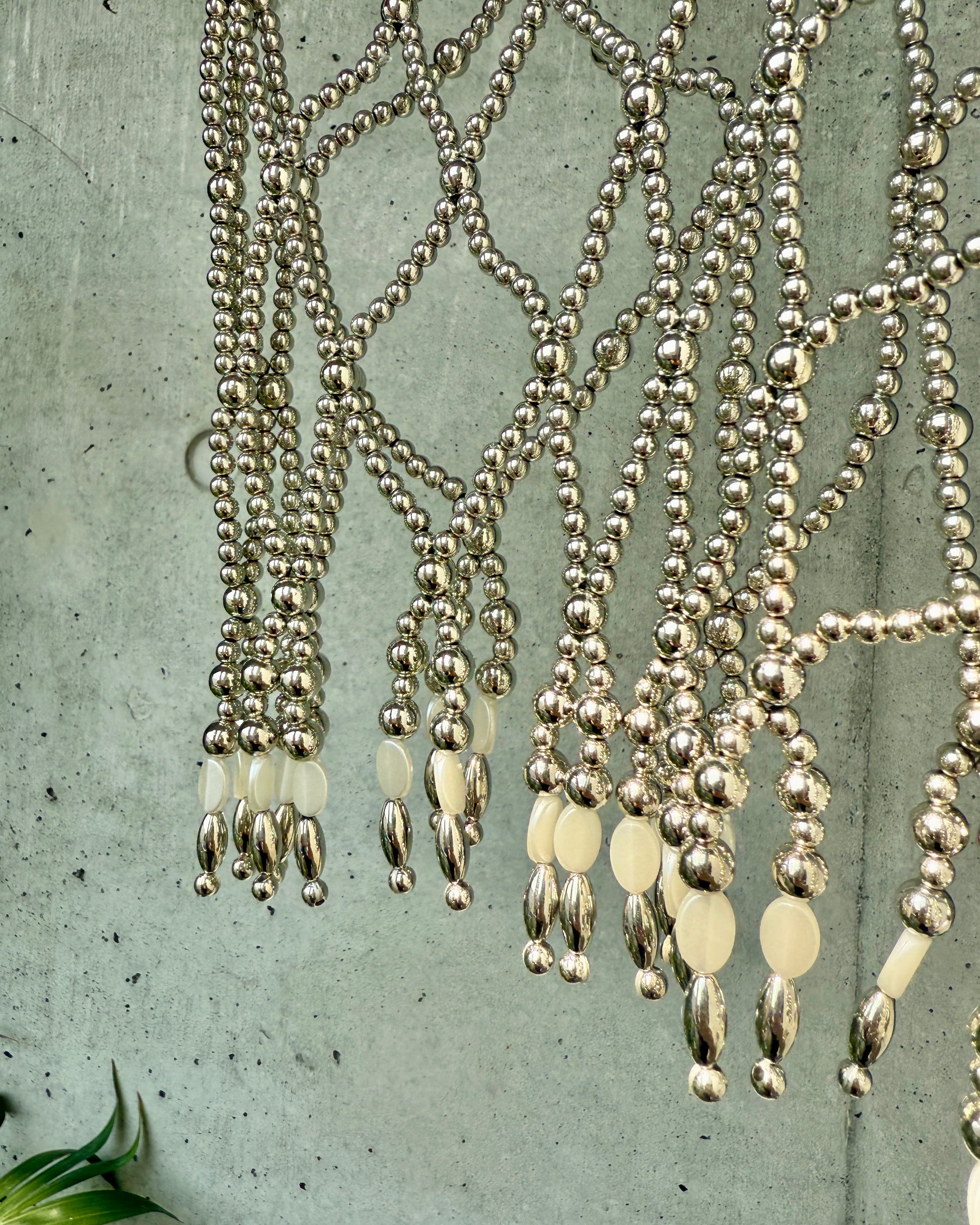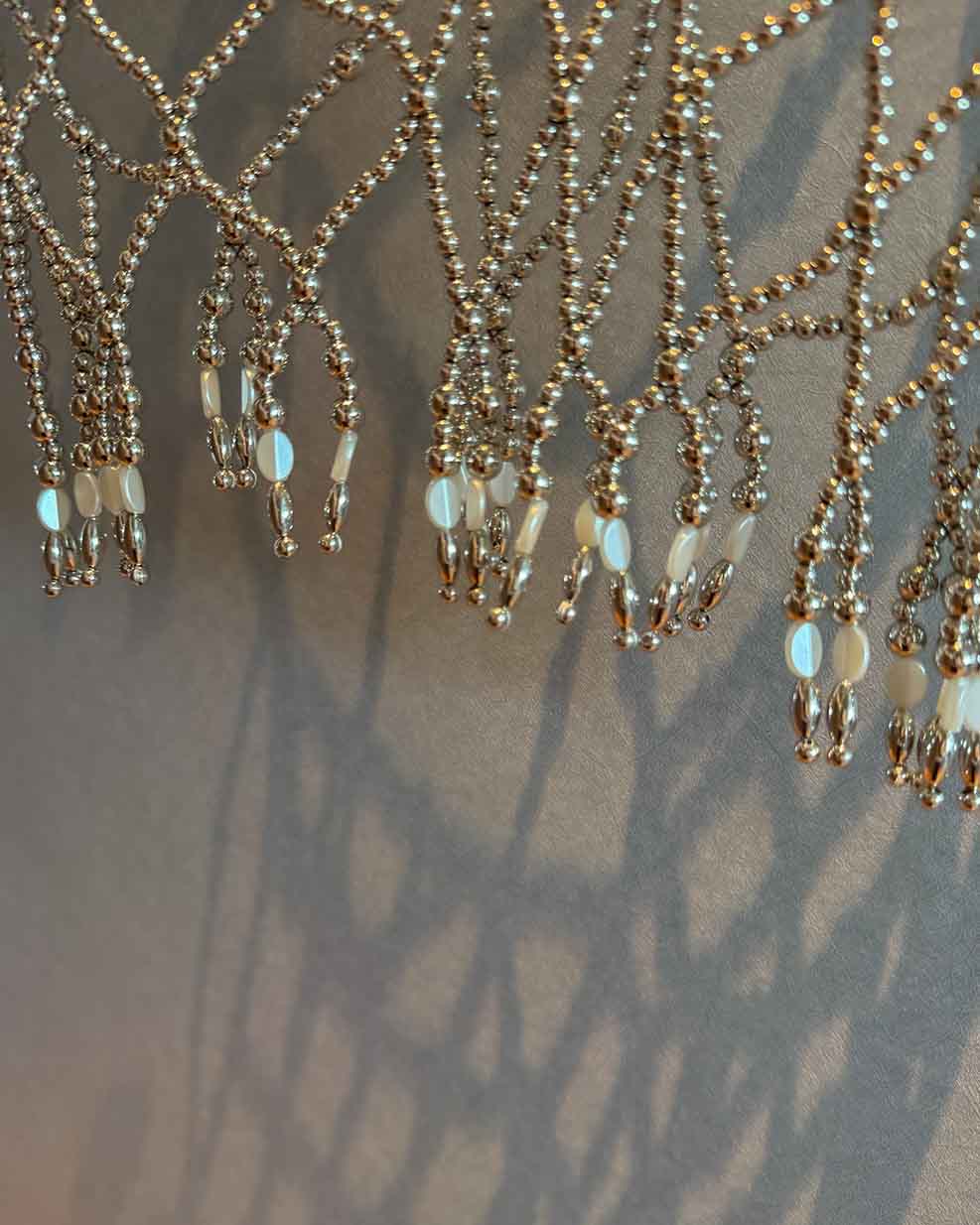 メタルビーズのもつハードな質感に対し、裾には平らなパールビーズをあしらったタッセルをプラス。